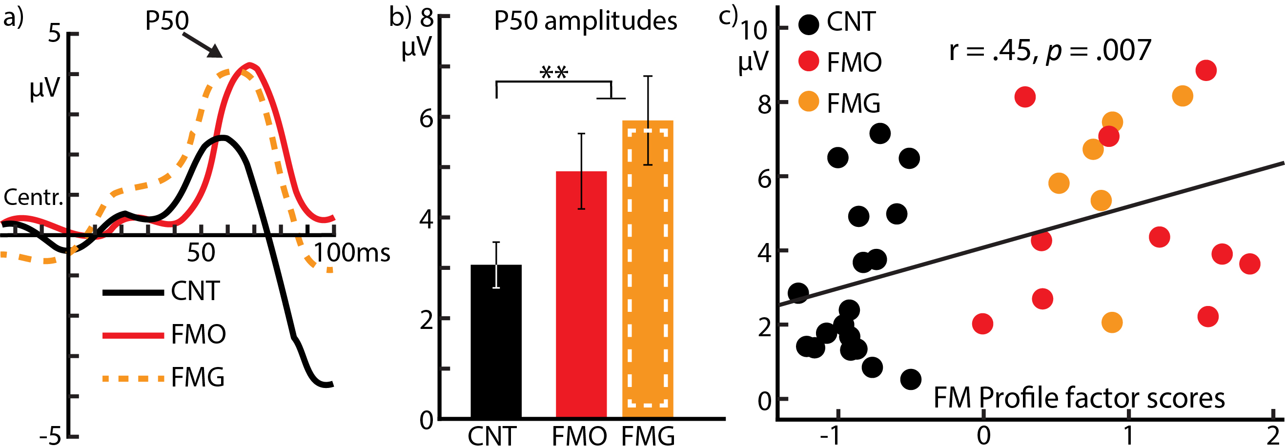 ERPs: Somatosensory domain. a) Somatosensory ERPs to the sensation averaged over central electrodes for all three groups. The P50 deflection is marked by an arrow. Negative is down on the y-axis. b) Histograms display mean +/- SEM of P50 amplitudes. c) Scatter plot shows correlation between P50 amplitudes and the FM profile PCA factor. People with FM had greater P50 amplitudes than other healthy matched adults. **p<.01