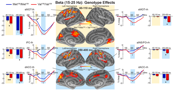 Histograms depict average beta power in various brain regions involved in motor preparation and planning during an early (60-110ms) and a later (250-400ms) window, averaged across all trials. Timecourses show the average change in beta change from baseline, and brain maps show source of signals. Val/Val consistently showed greater beta reduction than Met/Met, indicative of greater impulsivity.