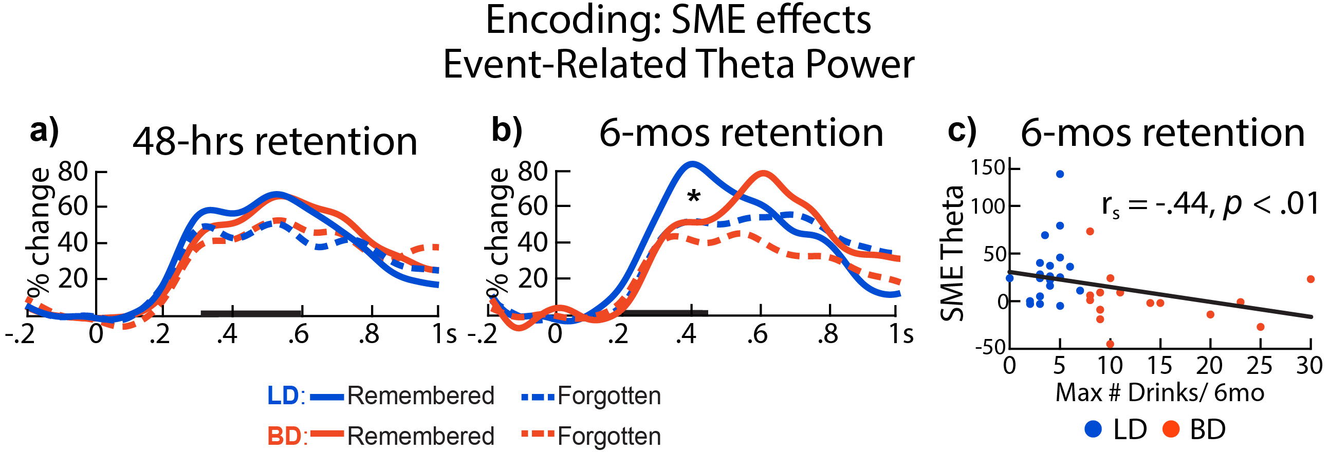 The same participants underwent a second retrieval session six months after the initial encoding session. Notably, the BD group exhibitied reduced theta oscillations and phase synchronization during the first presentation of images that they were able to remember six months later. Furthermore, the difference in evoked theta between remembered and forgotten images (SME) negatively correlated with the maximum number of drinks consumed in a day participants reported in the last six months. These findings suggest that memory encoding in binge drinkers may be characterized by inefficient network-level interactive engagement of brain areas responsible for memory formation, which may result from excitation/inhibition dysregulation as a function of increased drinking.