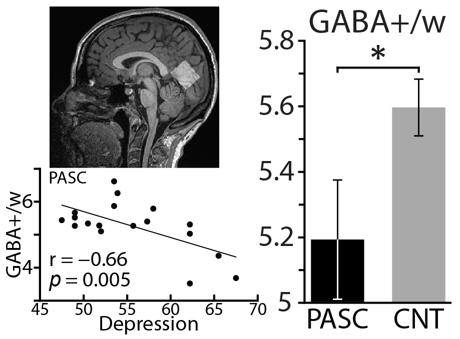 Participants recieved an MRS scan to determine the concentration of GABA related metabolites in vivo. GABA is the most common neurotransmitter and is ciritcal for regulation of neural activityIt was found that participants with PASC had less GABA than the control sample, and measures of GABA negatively correlated with depression. Lowered GABA suggests cortical hyperexcitability, which may result from neuroinflammation stemming from the body's immune system response to COVID-19. This hyperexcitability may underlie common PASC symtpoms, such as depression.
