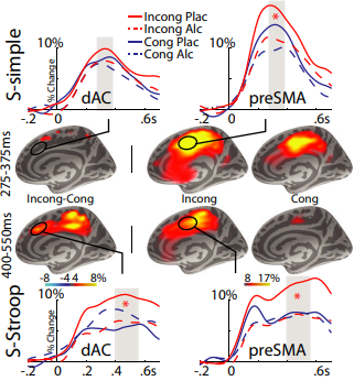Average evoked theta timecourses are shown, sourced from the dAC and preSMA, also shown. Alcohol attenuates theta during response conflict (incong), especially during the more difficult task.